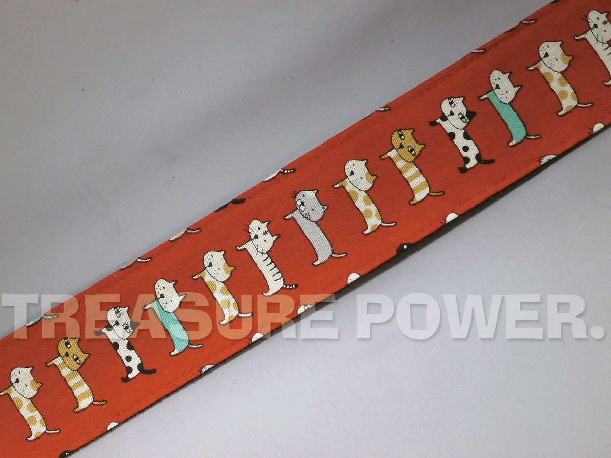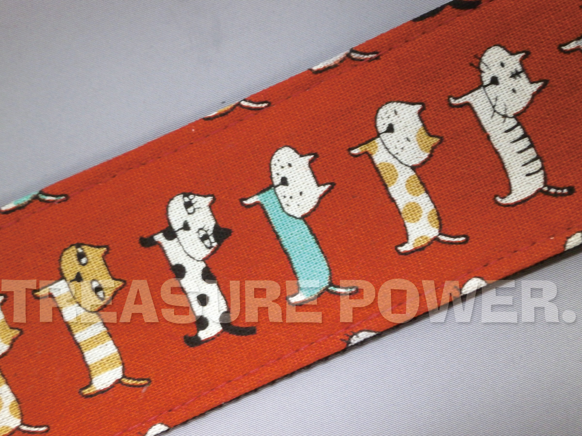 赤の生地にキュートなねこの柄が入っています。(写真をご参考下さい。)